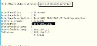 Melihat konfigurasi ip address dengan perintah Get-netipconfiguration.